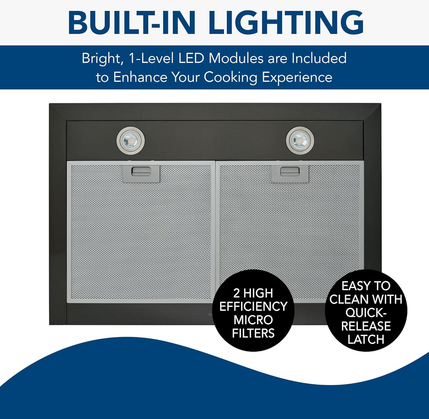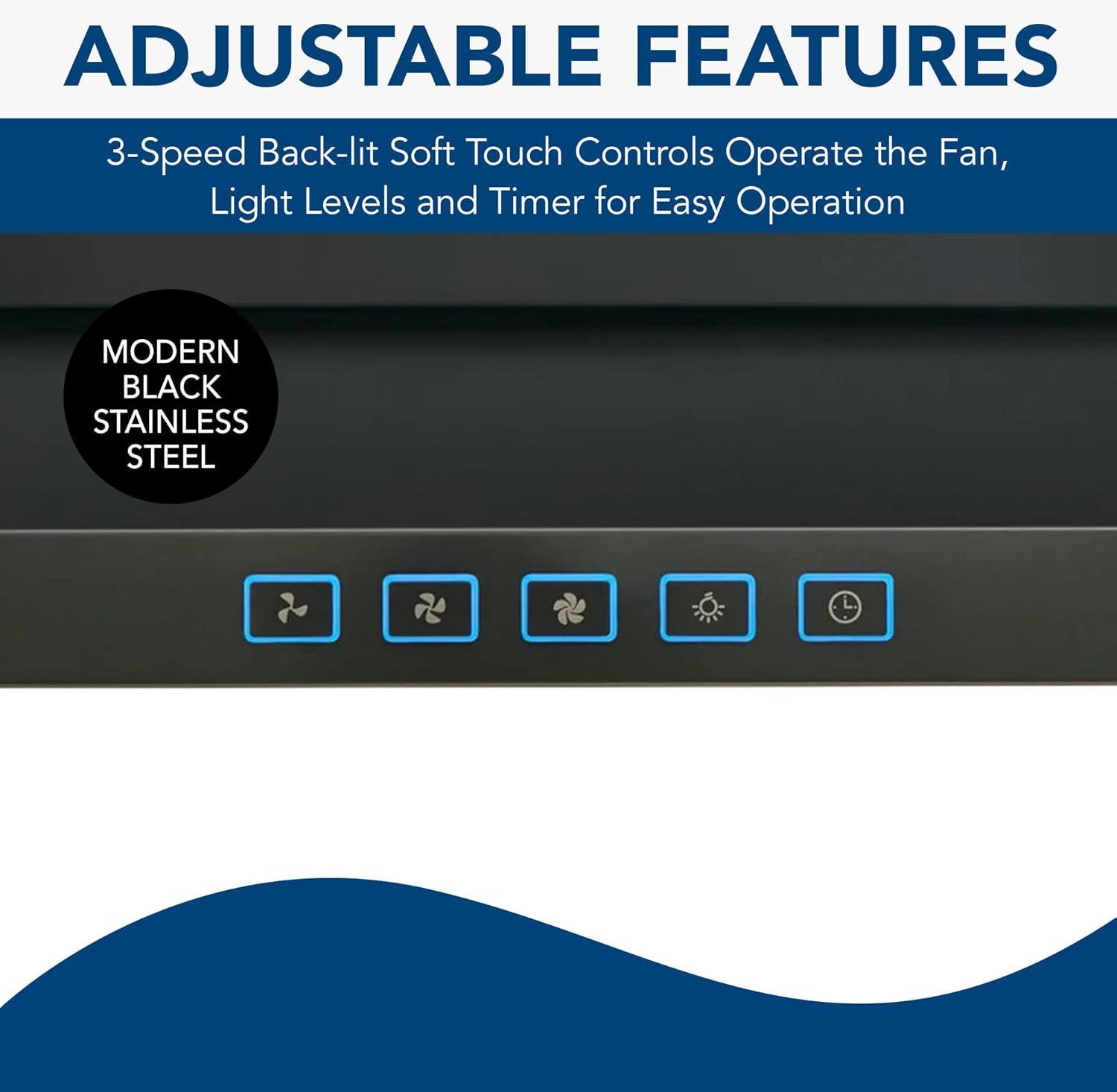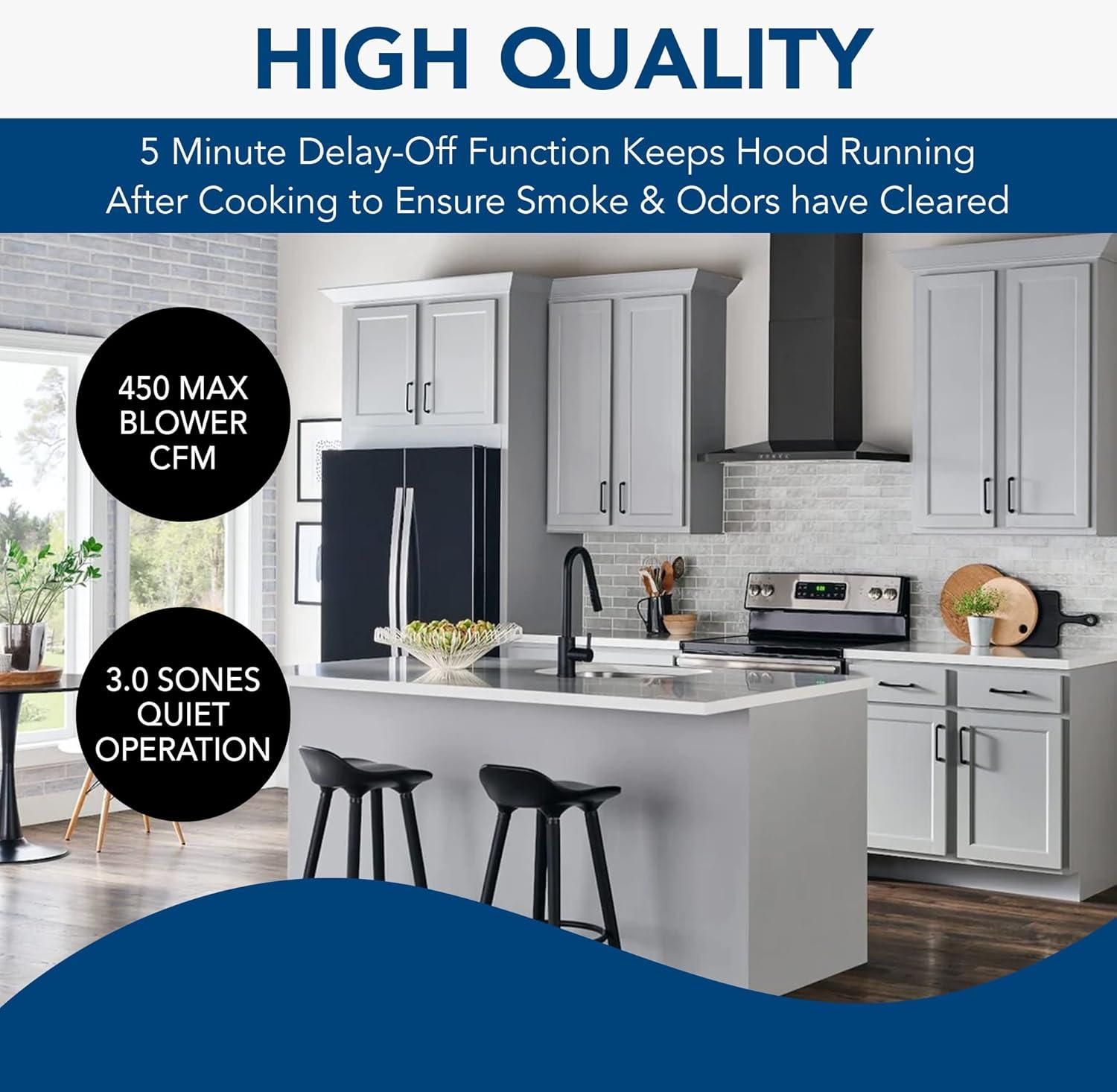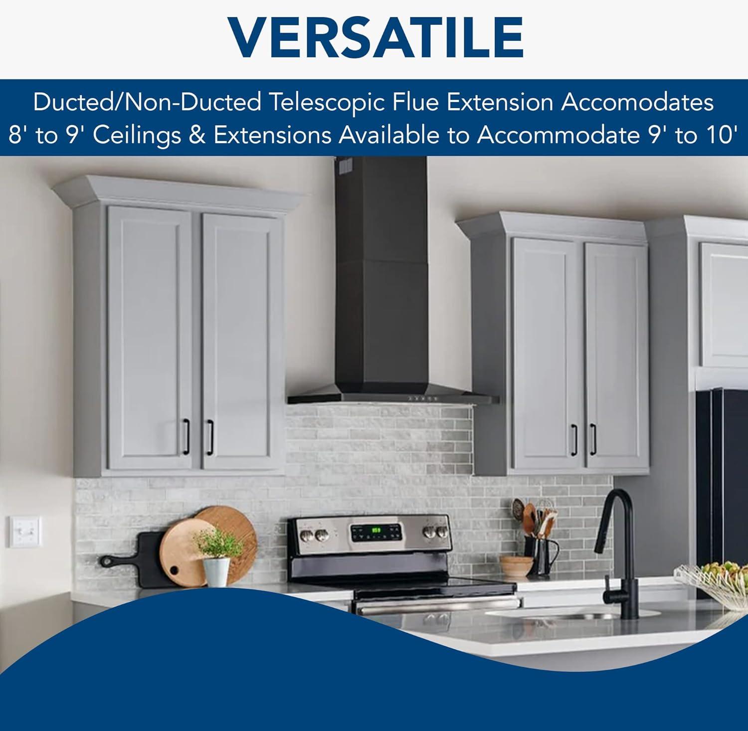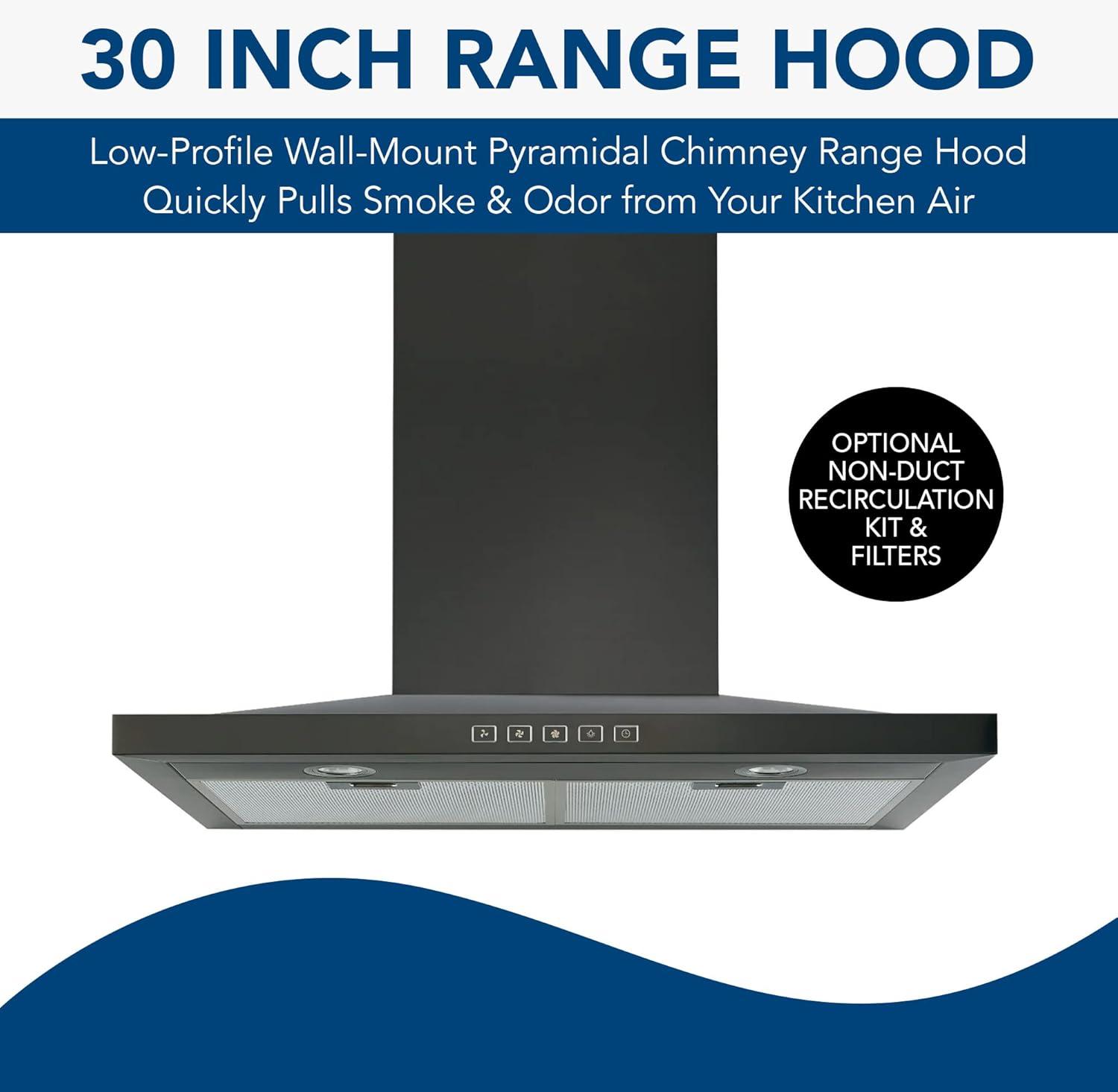 Enhance your kitchen with cleaner air and modern style with the Broan-NuTone Low-Profile Pyramidal Chimney Range Hood. Featuring a powerful 450 Max Blower CFM that operates at 3 sones at normal speed, this 30″ wall-mount range hood quickly eliminates odors and smoke as you cook while complimenting your kitchen. The bright 1-level LED modules provide the perfect amount of lighting over your cooking surfaces, while the ergonomic 3-speed back-lit soft touch control makes operation simple. After cooking, the 5-minute delay off function keeps the hood running to ensure that all smoke and odors have been removed from the environment for a superior performance every time. Functional and attractive, the range hood's stainless steel construction and sleek low-profile design add a touch of contemporary style to any modern home's kitchen. The durable micro mesh filters are dishwasher-safe for a quick and easy clean as needed, and they're made with a convenient quick-release latch for easy removal. To suit your needs, the ducted/ductless telescopic flue extension accommodates 8’ to 9’ ceiling heights with flue extensions available to accommodate ceiling heights from 9’ to 10’, and optional ductless recirculation kit and filters available for indoor exhaust recirculation.