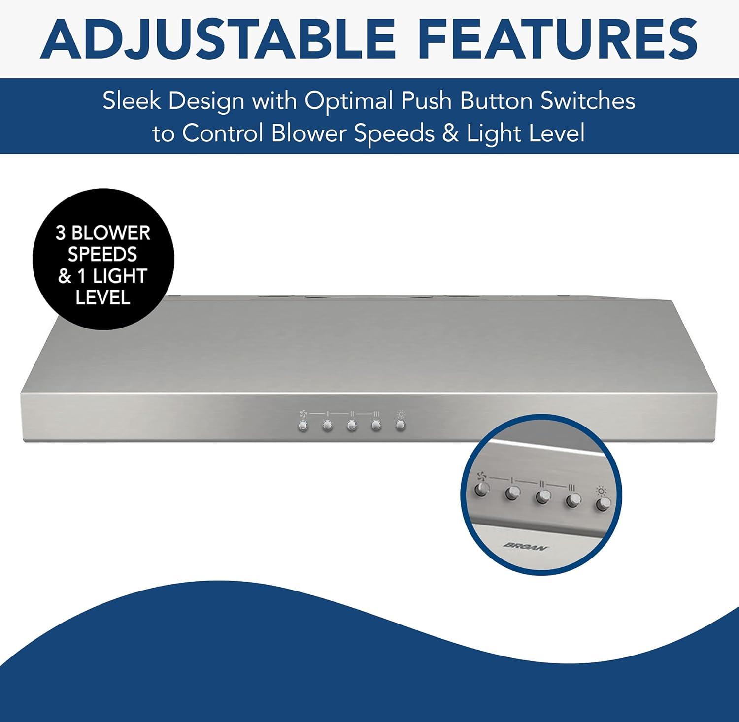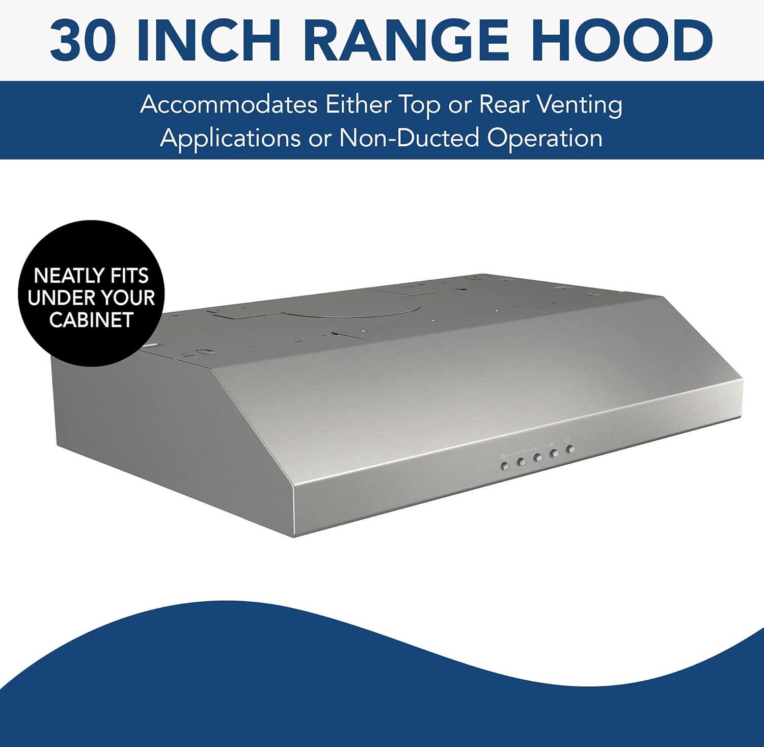 Product 1: 30-INCH UNDER-CABINET RANGE HOOD INSERT: Fits neatly underneath cabinets to offer a complete solution to your kitchen ventilation needs by providing both an exhaust fan and overhead light