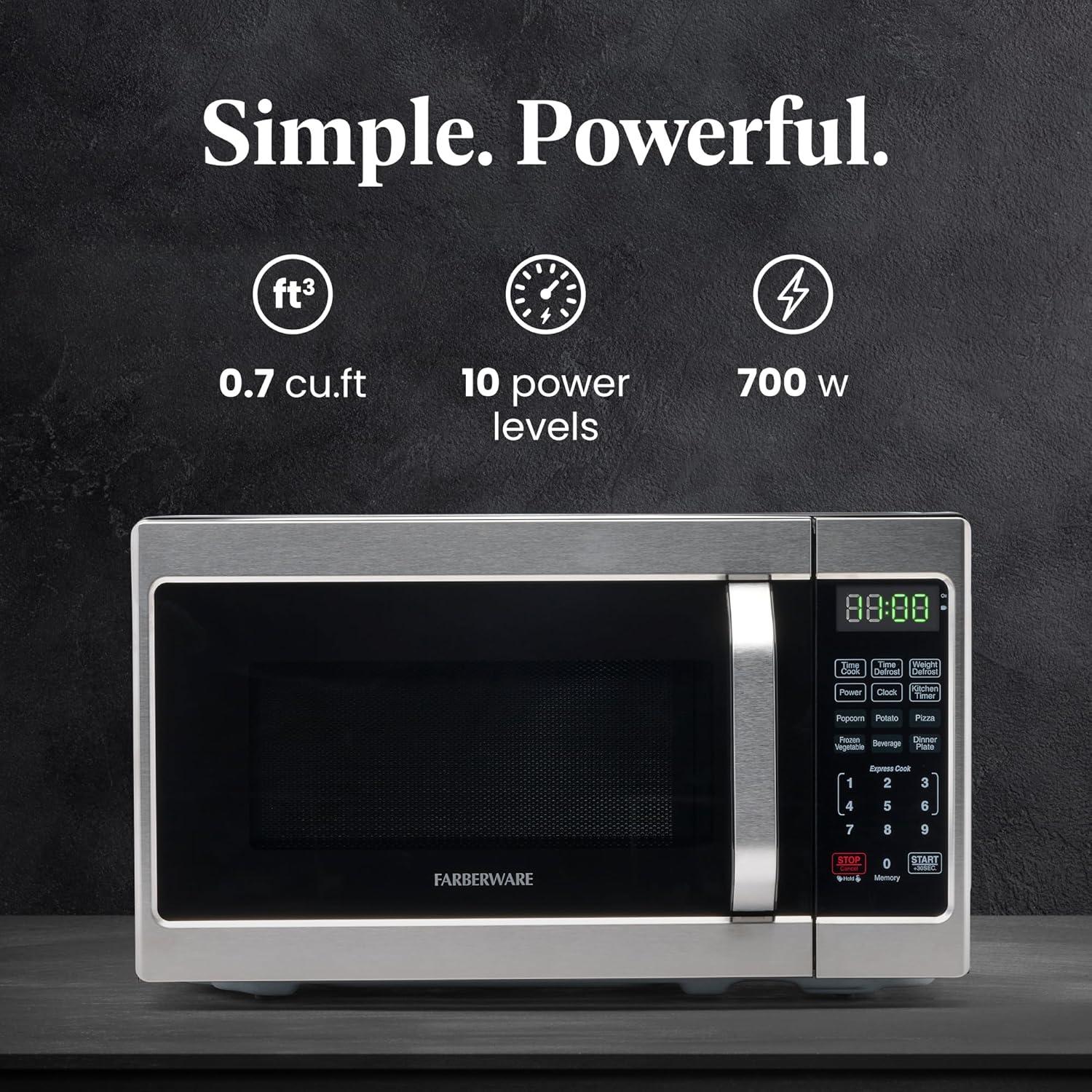 Product 2: PERFECT SIZE: Measuring 0.7 cu ft, this microwave is the ideal small-space solution that offers full-sized cooking in a compact space. It features an easy-to-clean interior and exterior and is perfect for the home or office.
