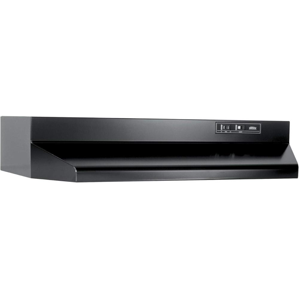 Upgrade your kitchen with the Broan-NuTone Economy 30-inch Under-Cabinet Easy Install Ducted Range Hood! This versatile range hood insert offers a complete solution to your ventilation needs by providing both an exhaust fan and overhead light for your stove. This range hood provides a MAX 210 CFM and 6.5 Sones blower performance to quickly remove smoke and cooking odors from the air, and the 2-speed rocker switch allows for quick fan adjustments and provides the ideal level of ventilation every time you cook. The built-in light with protective lamp lens accepts up to a 75-watt incandescent bulb (not included) to evenly illuminate your cooking area, and it is also controlled by a rocker switch for ease of use. This sleek black-colored steel range hood fits neatly underneath cabinets, and it features mitered sides and a hemmed bottom with no sharp edges to help ensure safety and provide a more decorative look. The one-piece dishwasher-safe aluminum grease filter offers easy cleaning so you can maintain optimum grease capture and keep your kitchen ventilated. This ducted range hood unit measures 17.5″ x 30″ x 6″ and installs as 3.25″ x 10″ ducted opening connected vertically or horizontally with damper, 7″ round vertical ducting (damper sold separately) to provide versatile installation options. The EZ1 one-person installation offers a two-bracket system that holds the hood for you while you make final electrical and ducting preparations. It can work in an ADA-compliant application as well. It is both UL-Listed and HVI-2100 Certified for safety and protection, and it includes a 1 year limited warranty. Enhance your kitchen with the Broan-NuTone BUEZ030BL Range Hood!
