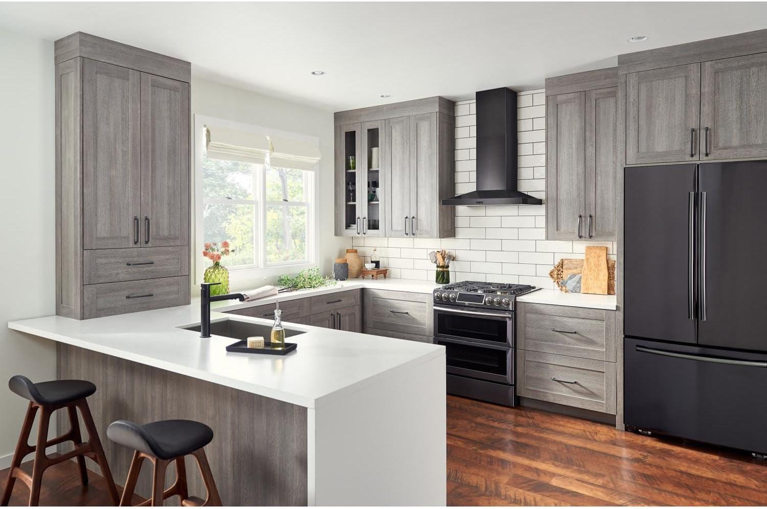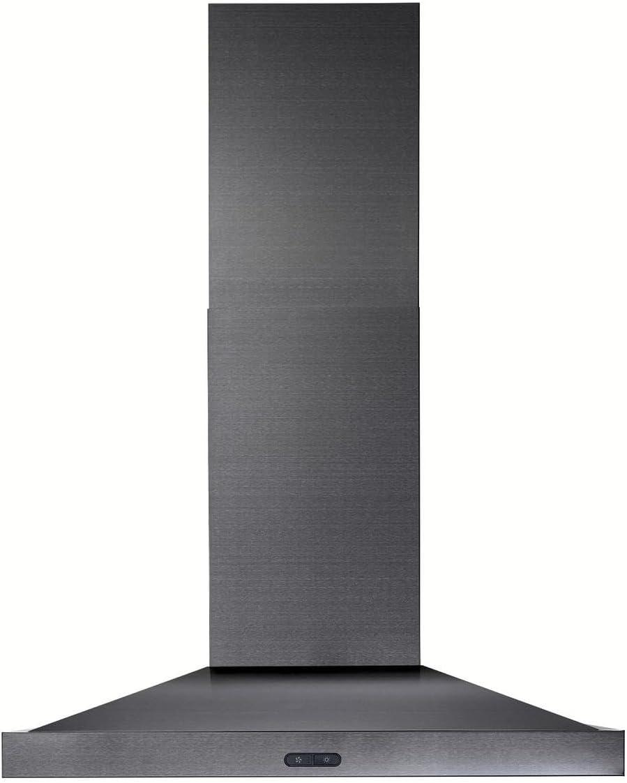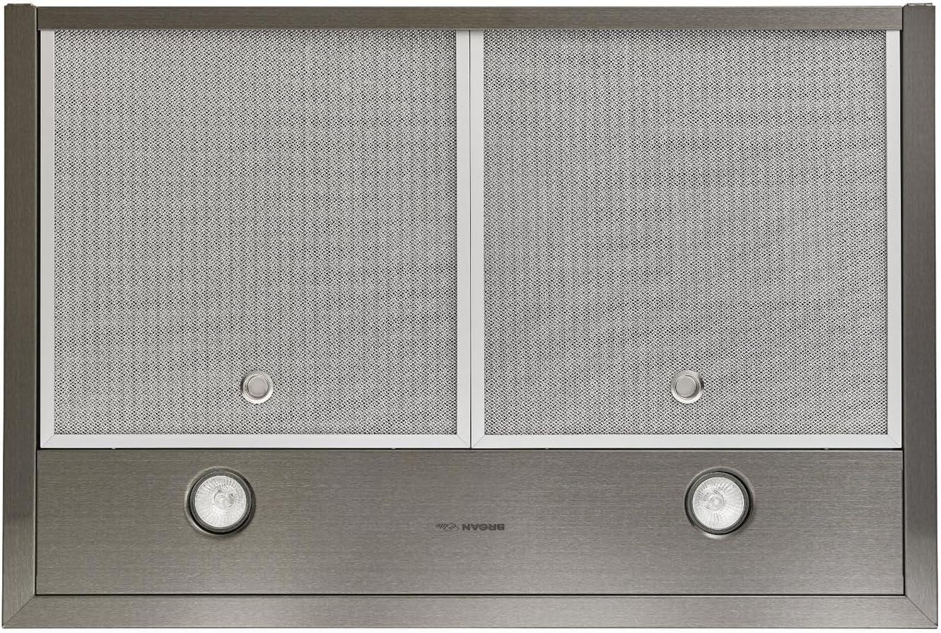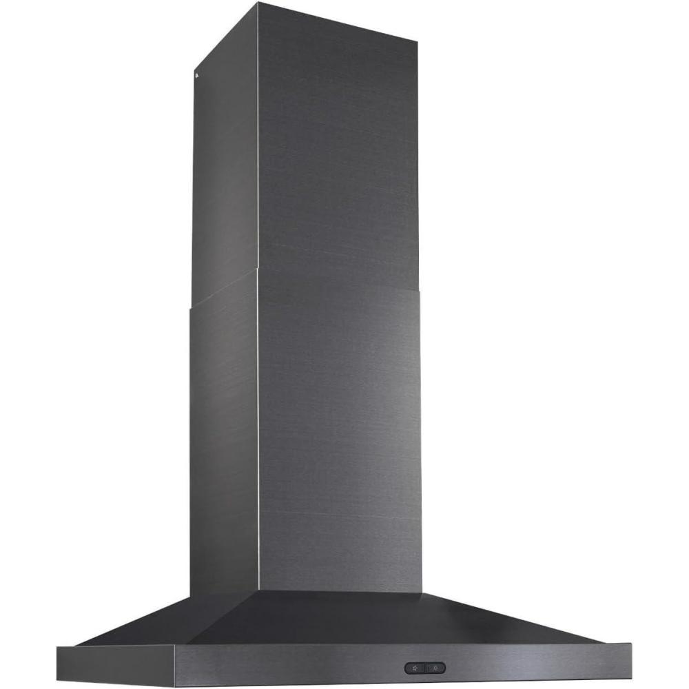Upgrade your kitchen with this Broan Elite Chimney Range Hood! This versatile hood is the perfect solution to your ventilation needs serving as both an exhaust fan and overhead light for your cooktop. Mounting height of the black stainless steel unit is 24″ to 30″ above the cooking surface. The powerful 500 CFM internal blower operates at 1.5 Sones at normal speed for a quiet and efficient ventilation. This unit is equipped with halogen bulbs with two intensity settings that flood the cooktop and surrounding area with generous illumination (bulbs included). The tap-touch, three-speed capacitive control features a smooth, easy-to-clean surface. It includes dishwasher-safe, micro-mesh filters for easy cleaning and grease removal. The ducted telescopic flue accommodates ceiling heights for 8' to 9'. This unit is non-duct capable with the use of the accessory Non-Duct Kit (model number HRKMBLS sold separately). Enhance your home today with the sleek Broan Elite Chimney Range Hood!