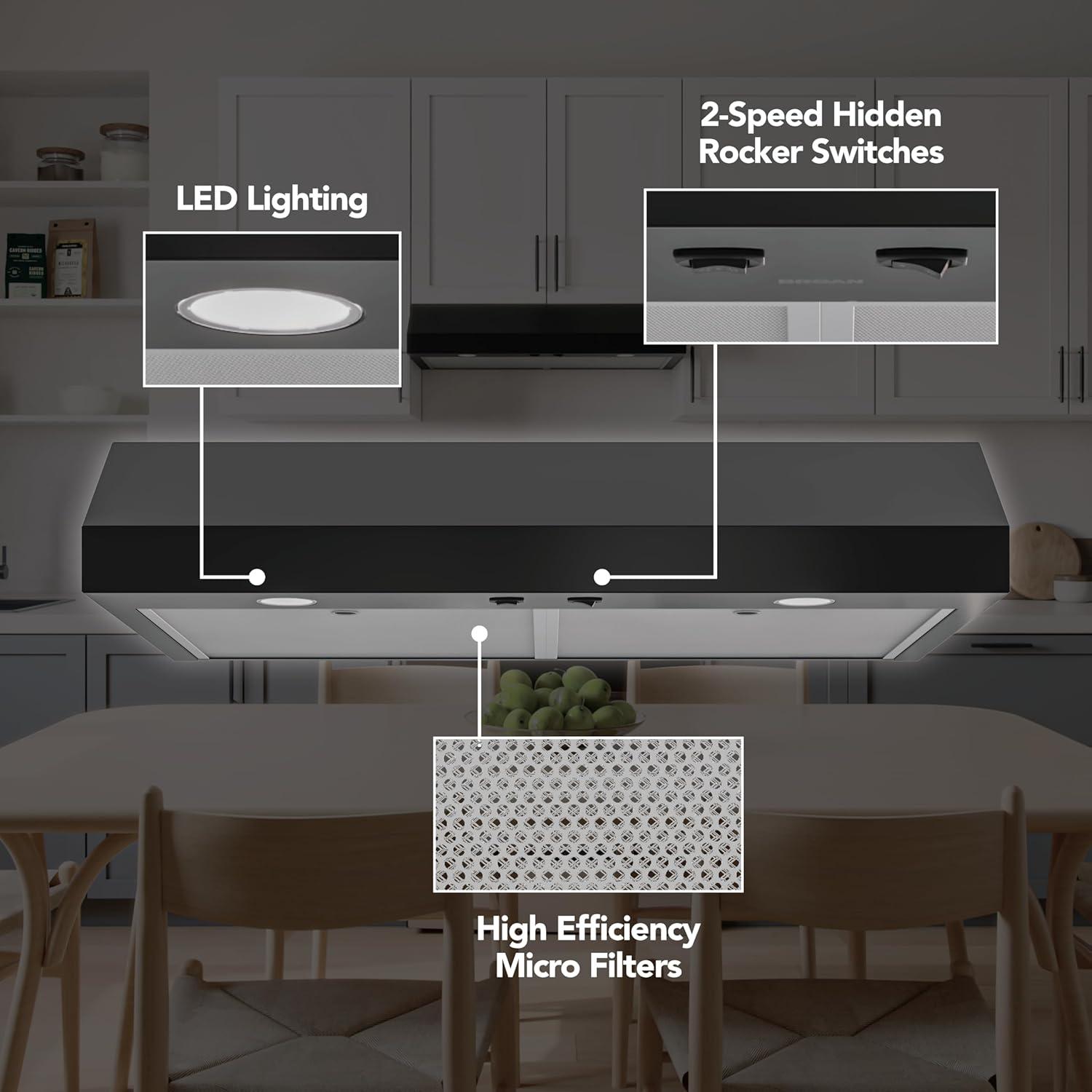 UP TO 44% QUIETER: With sound equivalent to a refrigerator running, this vent hood is up to 44% quieter than competition at 1.5 sones on working speed. The hidden rocker switches control the 2-speed fan and 1-level lighting
