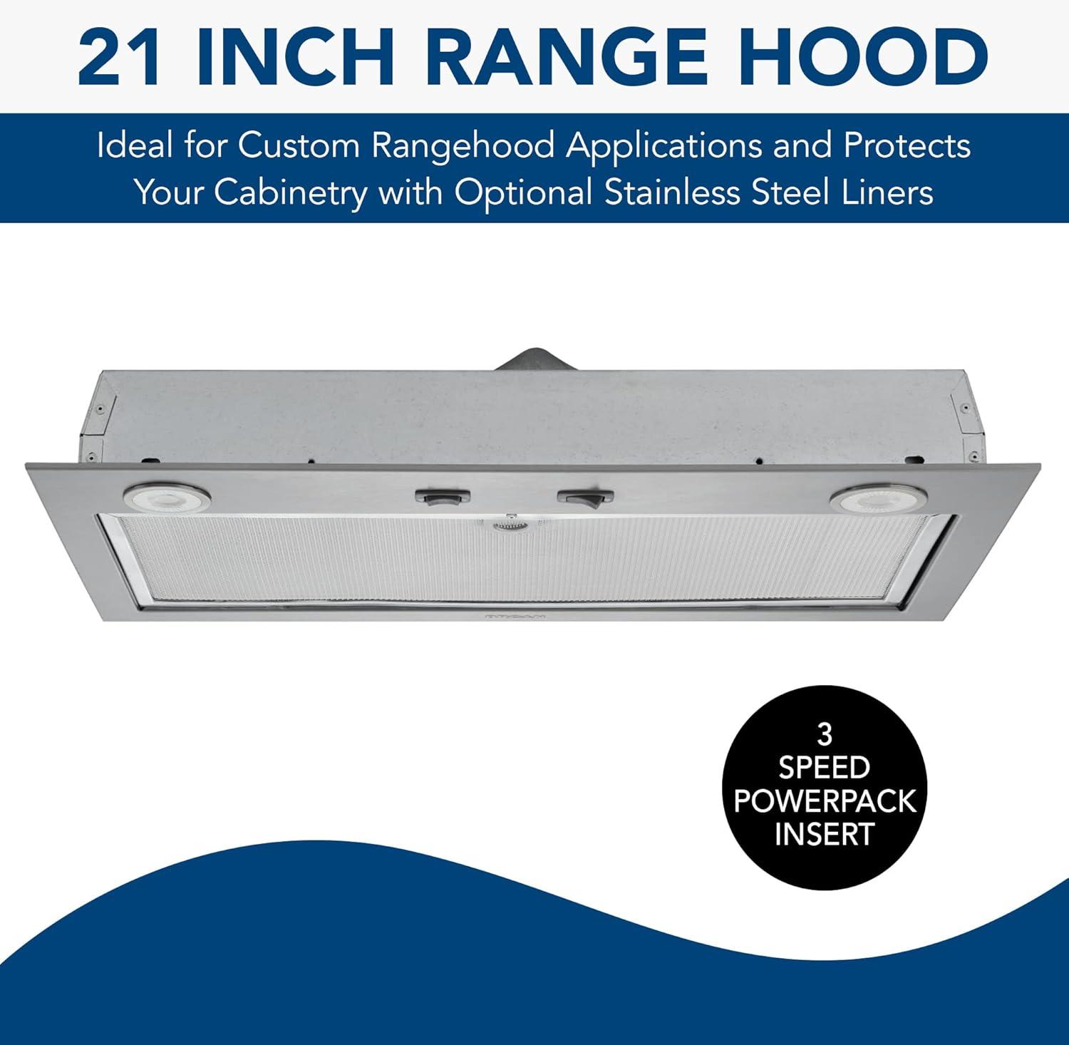 The 21-inch range hood insert provides efficient ventilation with a 300 Max Blower CFM, 2-speed exhaust fan to quickly remove smoke and odors.