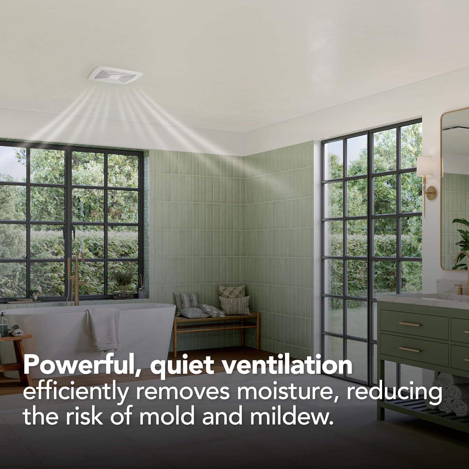 Powerful Bathroom Fan: 110 CFM, Effective ventilation to remove moisture and reduce the risk of mold or mildew in most full baths up to 105 sq. ft. Permanently lubricated AC motor engineered for continuous operation